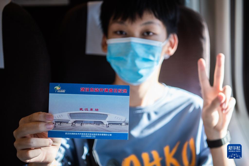 8月12日,乘坐武漢東站首發列車的旅客展示武漢東站開通紀念品。