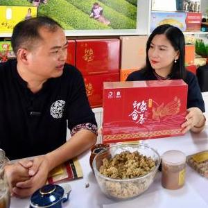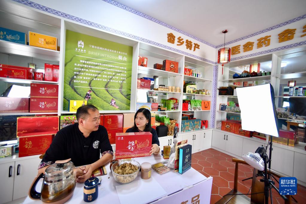 在福建省寧德市蕉城區金涵鄉上金貝村的直播間,上金貝村黨支部書記蘭春華(左)在與主播向網友推介家鄉特產(8月11日攝)。