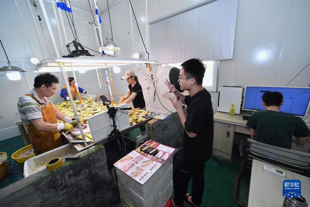 主播在福建省霞浦縣“趕海父子”直播間內推介當地盛產的大黃魚(8月10日攝)。
