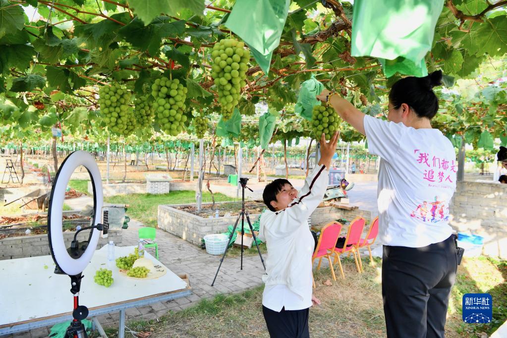 在福建省福安市賽岐鎮象環村葡萄種植園,返鄉創業大學生林恩輝(右)、陳莉瑾在直播葡萄采摘(8月9日攝)。