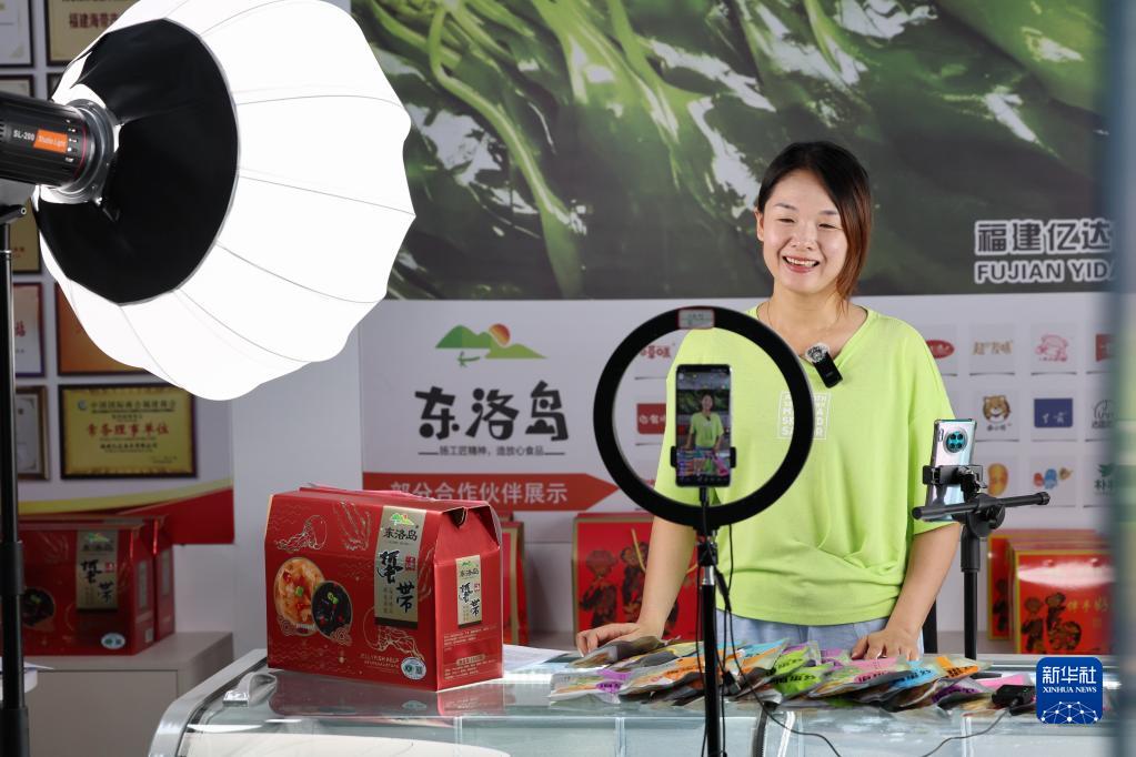 福建省連江縣一名帶貨主播在直播間介紹東洛島海產品(8月9日攝)。