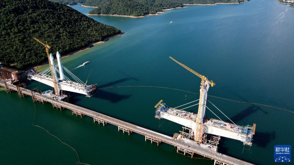 這是正在建設中的中國鐵建大橋局池黃鐵路太平湖特大橋(8月12日攝,無人機照片)。