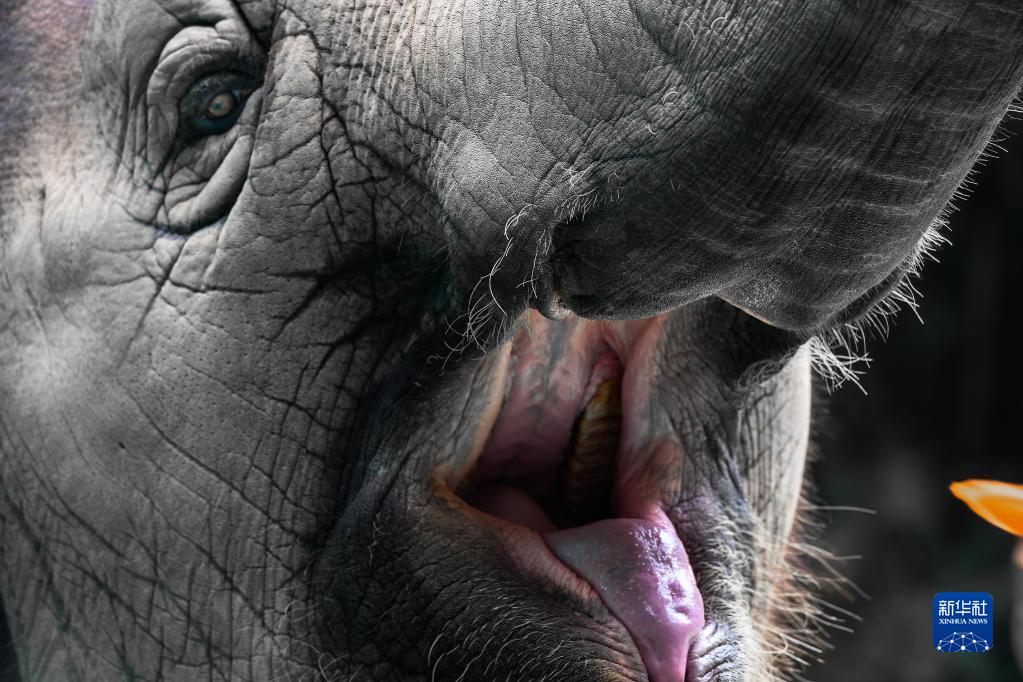 8月12日,廣州長隆野生動物飼養員引導亞洲象張開嘴巴,以便檢查它的臼齒健康狀況。新華社記者 劉大偉 攝