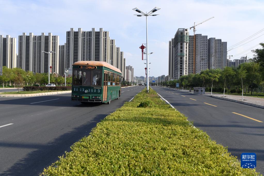 一輛新能源公交車行駛在蘭州新區(8月9日攝)。