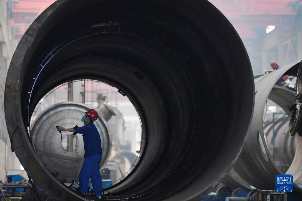 工人在蘭州新區蘭石集團高端裝備產業園車間內作業(8月11日攝)。