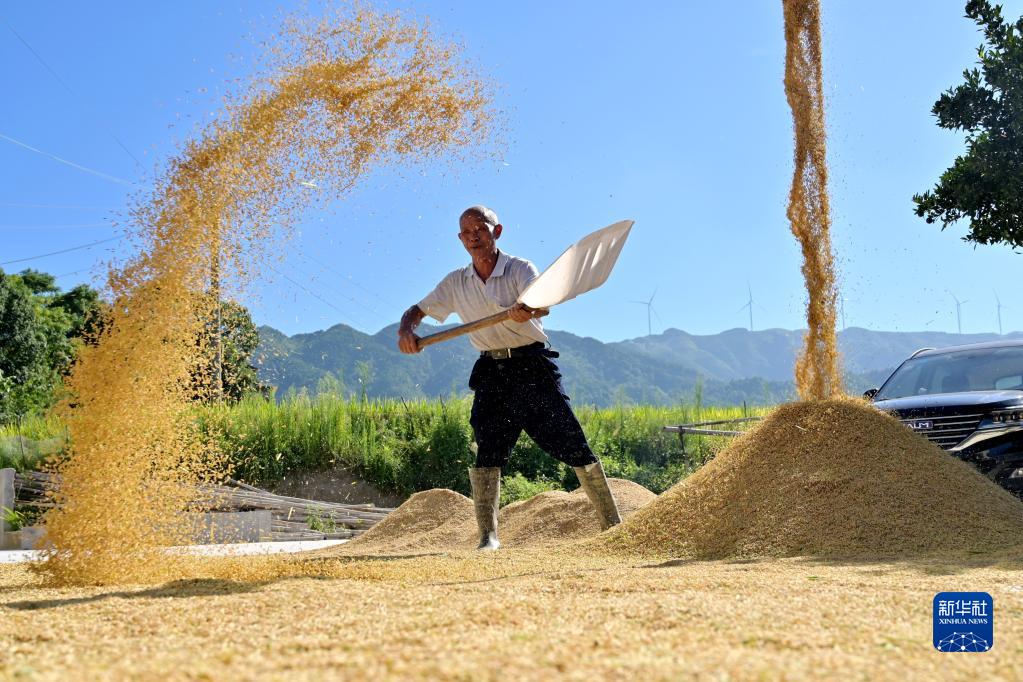 8月12日,在湖南省雙峰縣井字鎮銅梁村,農民在曬稻谷。