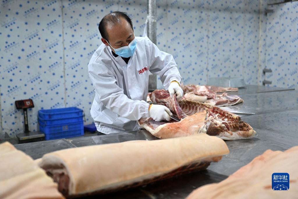 8月13日,三亞美菜網配送網點的工作人員在處理冷鮮肉。