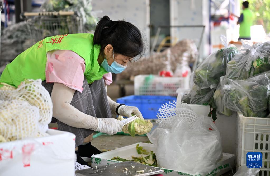 8月13日,三亞美菜網配送網點的工作人員在處理蔬菜。