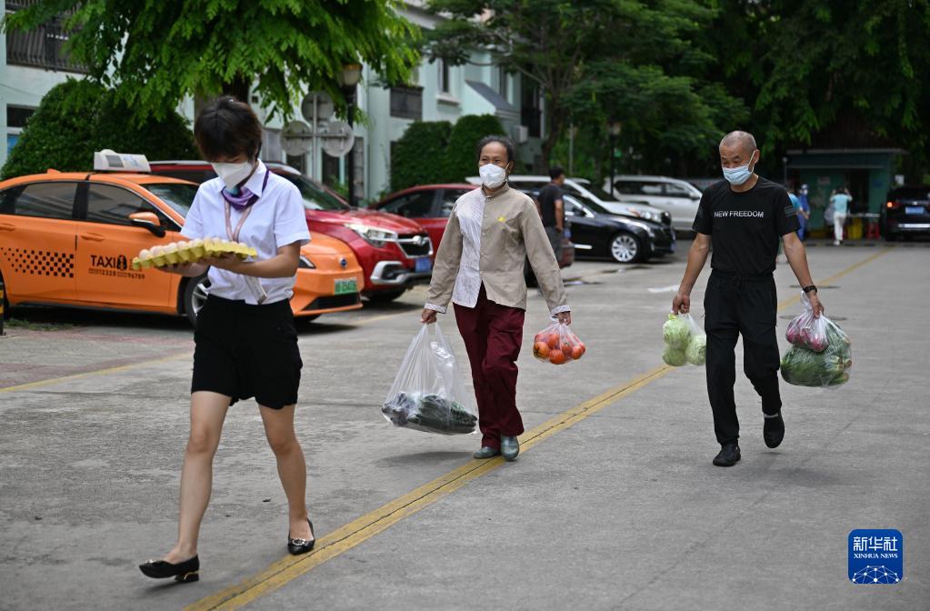 8月13日,三亞市一個小區的物業工作人員(左一、左二)幫居民將生活物資送往家中。