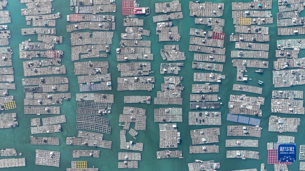 這是8月12日拍攝的位于連江縣苔菉鎮東洛村的漁排,村民在漁排上養殖鮑魚(無人機照片)。在連江縣苔菉鎮東洛村,當地鮑魚加工企業收購村民養殖的鮑魚,并為鄉鎮投資打造深海鮑魚機械化養殖平臺,實現傳統養殖業向深遠海、智能化發展。