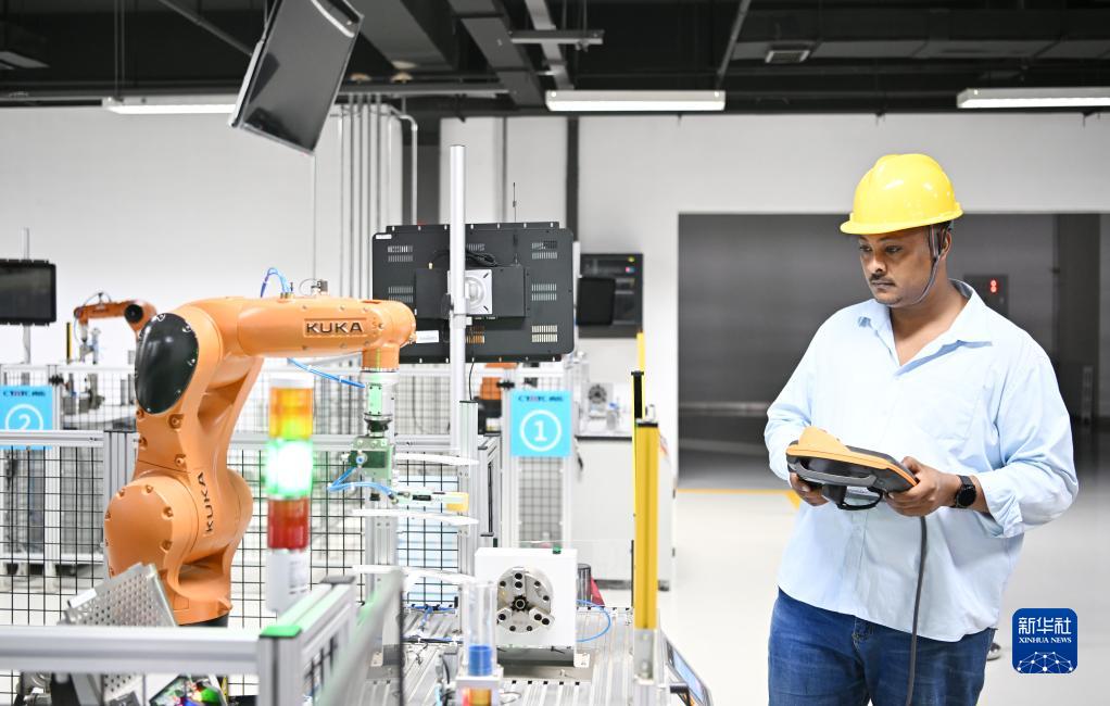 在天津職業技術師范大學,韓士蘭操作機器人設備(7月29日攝)。