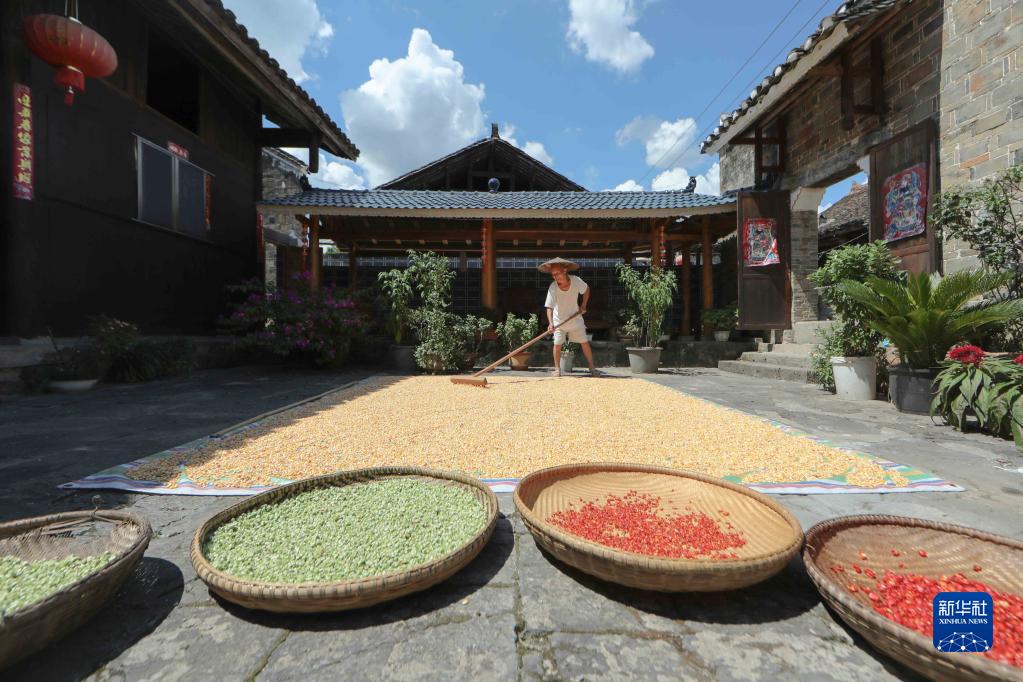 8月13日,村民在貴州省黔東南苗族侗族自治州岑鞏縣注溪鎮衙院村晾曬玉米、辣椒等農作物。