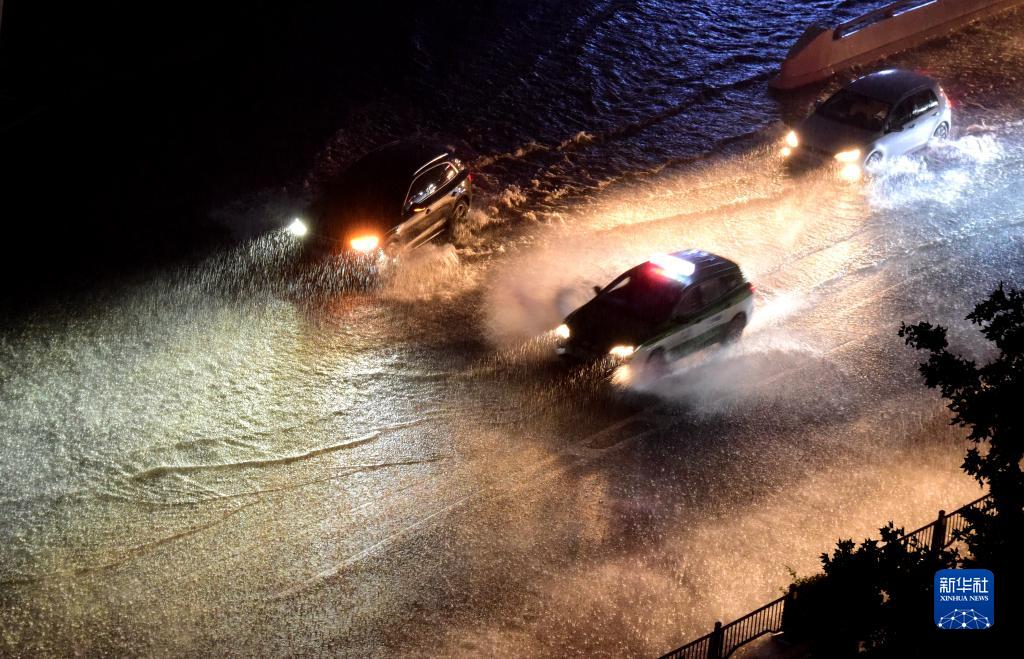 8月8日,汽車在鄭州市花園路上涉水行駛。