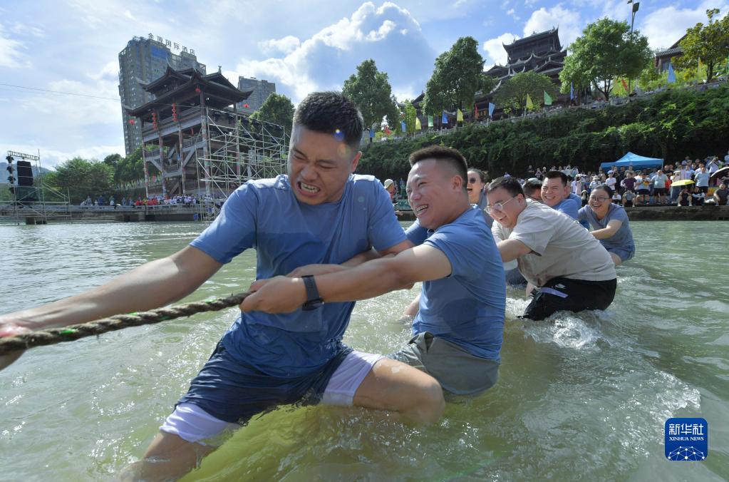 8月7日,在湖北省宣恩縣城貢水河上,選手們進行“水上拔河”比賽。