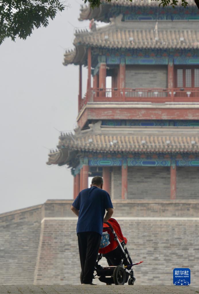 8月13日,市民在南中軸線御道景觀區的永定門城樓前休閑。