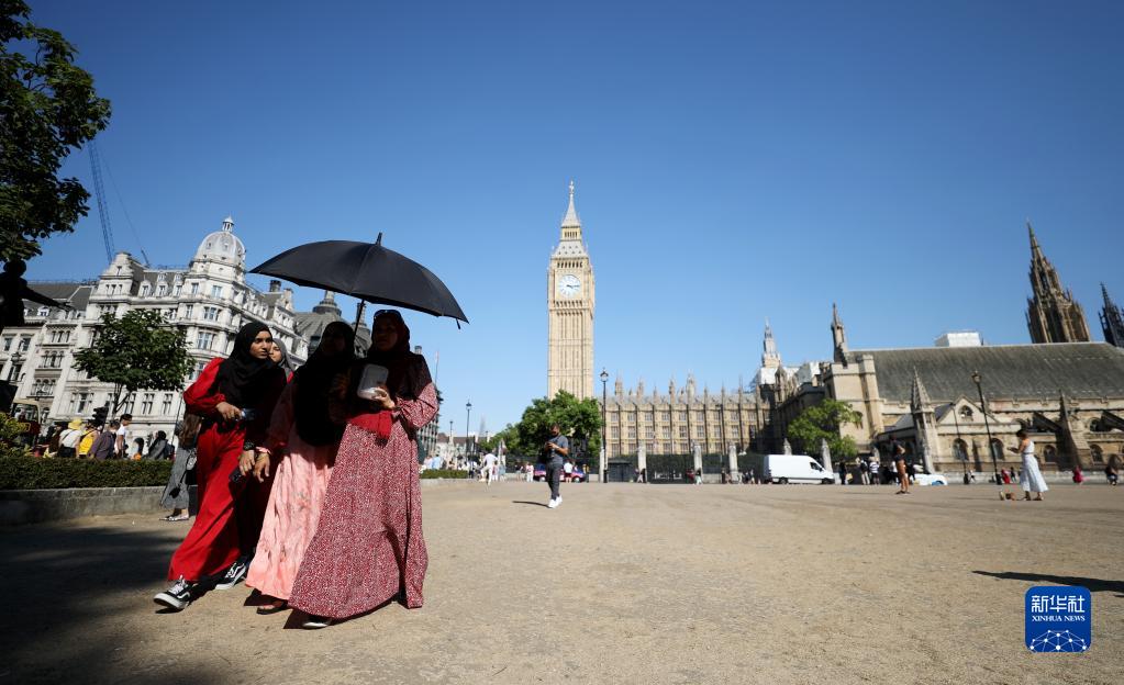 8月13日,在英國倫敦議會廣場,人們走過枯黃的草地。