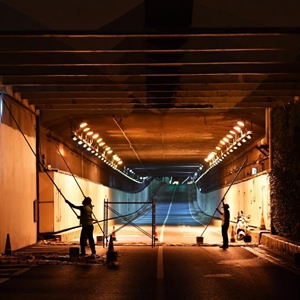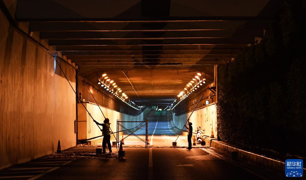 位于湖南省長沙市的營盤路隧道是橫穿湘江的第一條隧道,也是連接湘江兩岸的過江主干道。檢修工人利用每周末0時至6時的“空窗期”,對總長達8.5公里的隧道進行線路檢修、坑洞修補等養護作業,保障市民順暢出行。