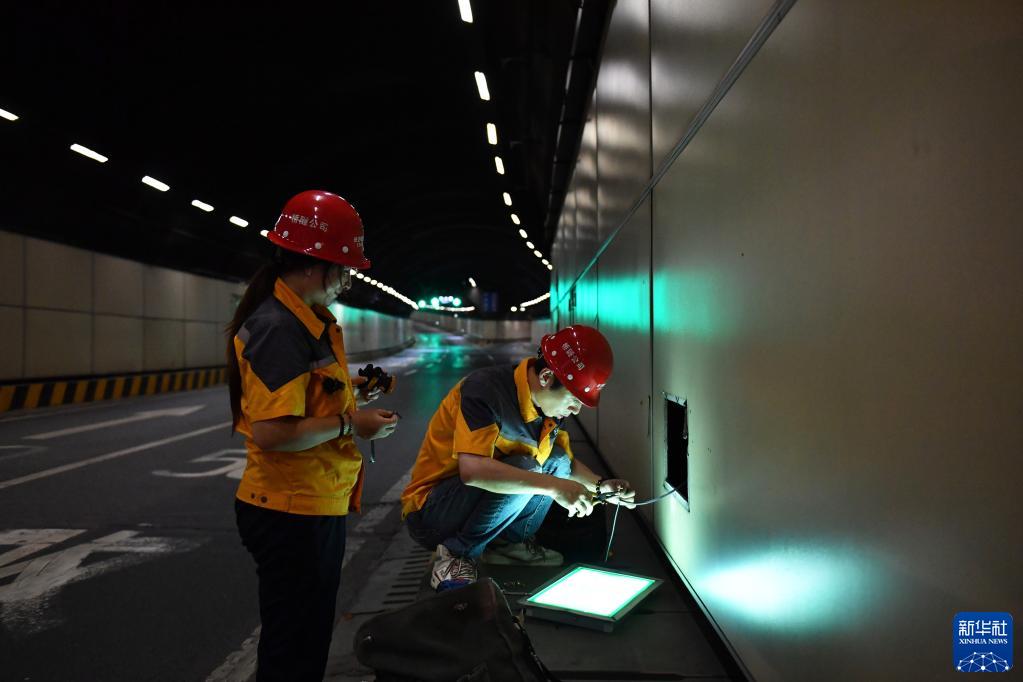 位于湖南省長沙市的營盤路隧道是橫穿湘江的第一條隧道,也是連接湘江兩岸的過江主干道。檢修工人利用每周末0時至6時的“空窗期”,對總長達8.5公里的隧道進行線路檢修、坑洞修補等養護作業,保障市民順暢出行。