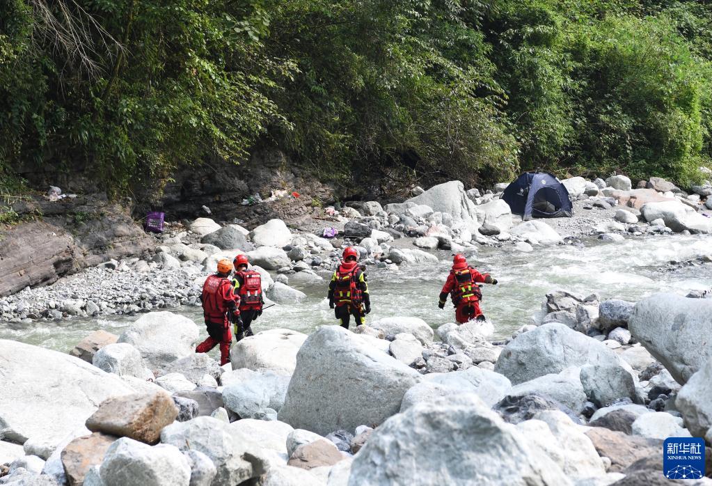 8月14日,在四川省彭州市龍門山鎮龍槽溝,消防救援人員在河道搜救。
