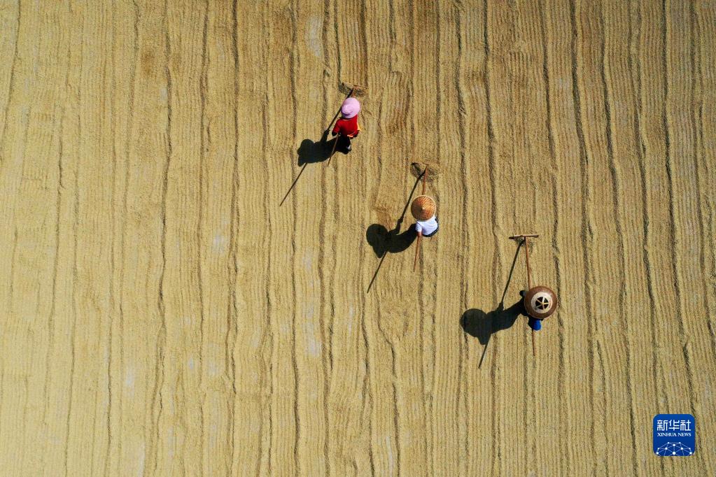 8月14日,村民在貴州省黔東南苗族侗族自治州岑鞏縣思旸鎮坪壩村晾曬種稻(無人機照片)。