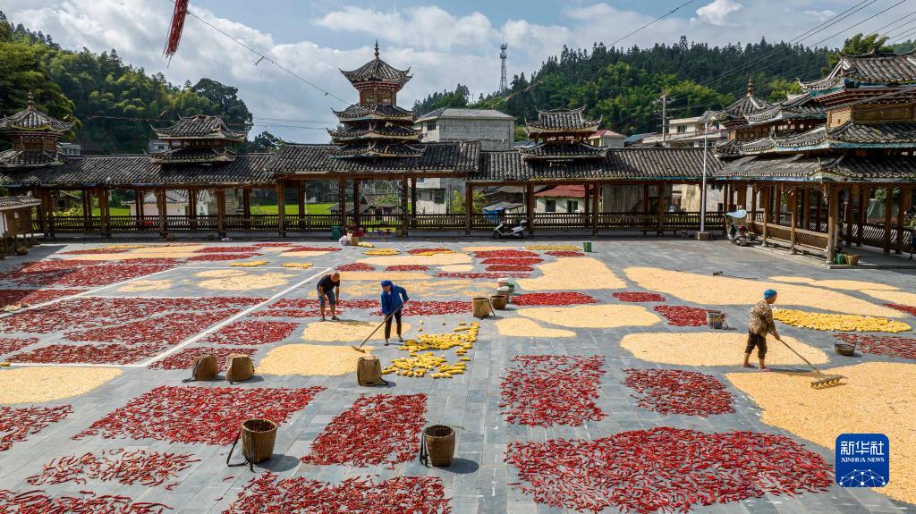 立秋過后,貴州高原鄉村處處曬秋忙。玉米、辣椒、稻谷、黃豆等農作物晾曬在農家房前屋后,與周圍別具特色的田園風光融為一體,繪就出一幅幅美麗的豐收圖景。