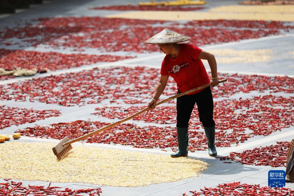 立秋過后,貴州高原鄉村處處曬秋忙。玉米、辣椒、稻谷、黃豆等農作物晾曬在農家房前屋后,與周圍別具特色的田園風光融為一體,繪就出一幅幅美麗的豐收圖景。