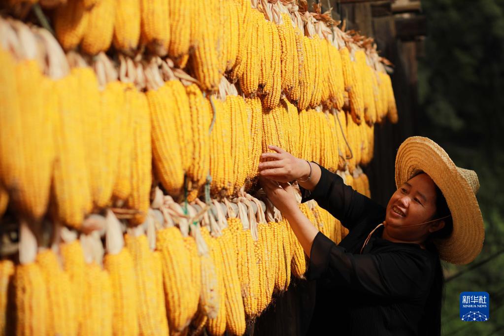 8月14日,村民在貴州省黔東南苗族侗族自治州劍河縣久仰鎮基佑村晾曬玉米。