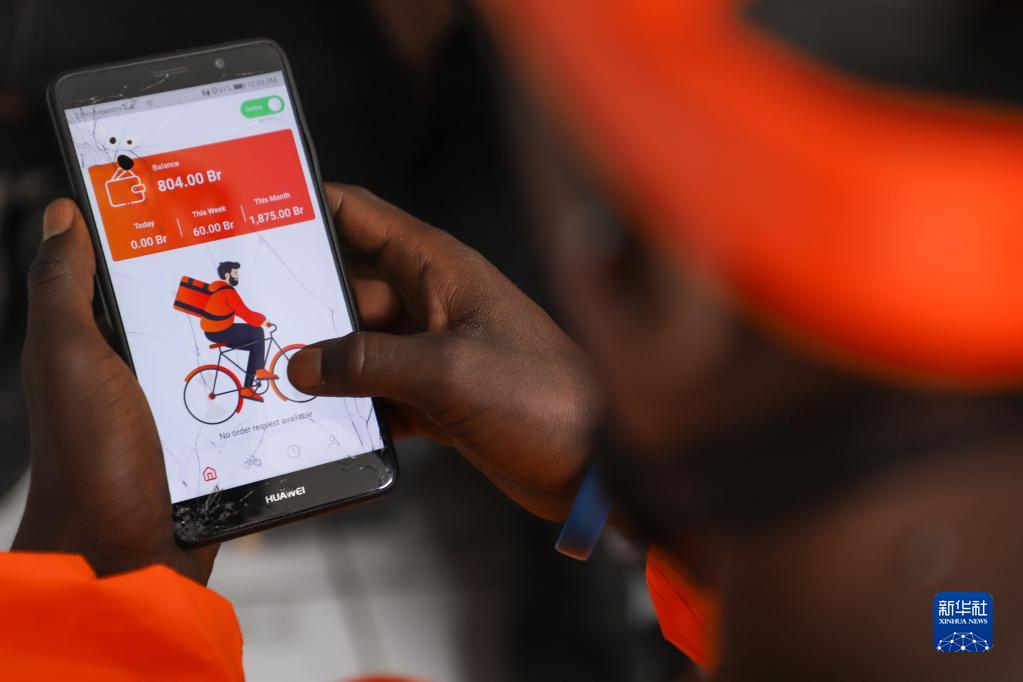 7月19日,在埃塞俄比亞首都亞的斯亞貝巴,外賣騎手阿斯納克·尼古西通過手機應用程序處理訂單。