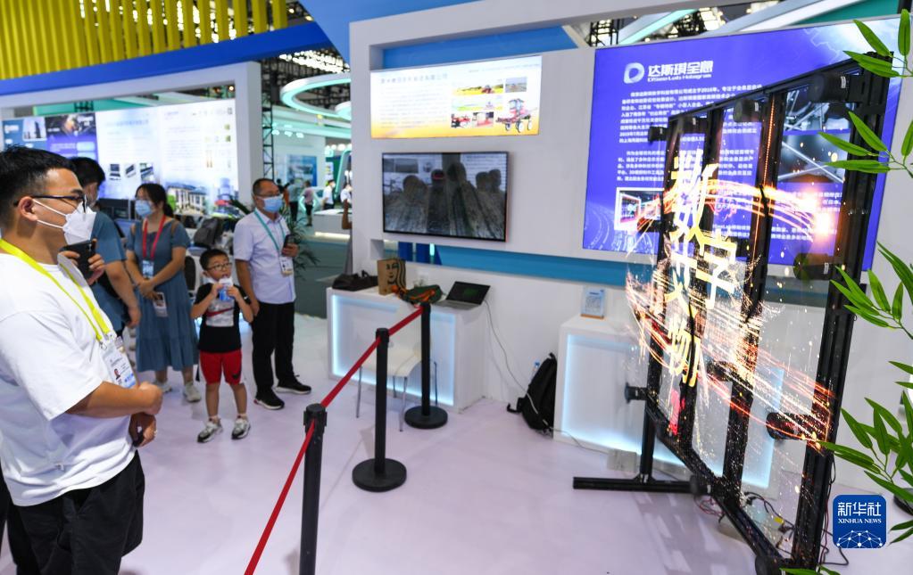 8月14日,在西安國際會展中心中國館,參觀者在觀看全息顯示設備。