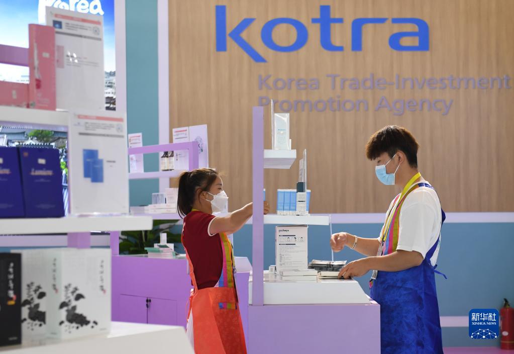 8月14日,西安國際會展中心國際館韓國展區的店員在整理商品。