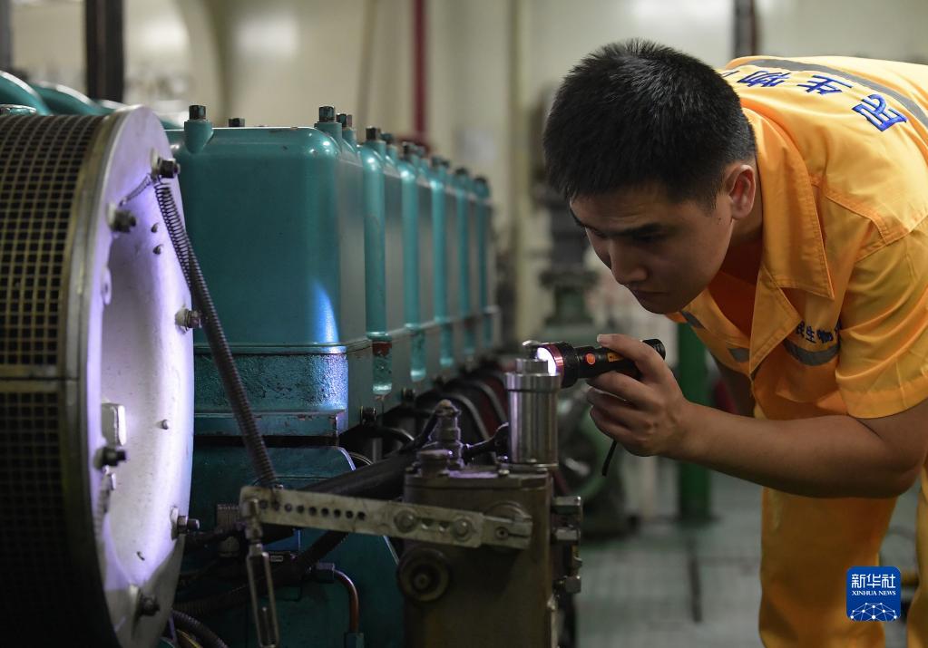 夜晚值守在輪機艙內的機工王小龍頂著艙內高溫巡查設備運行情況(8月8日攝)。