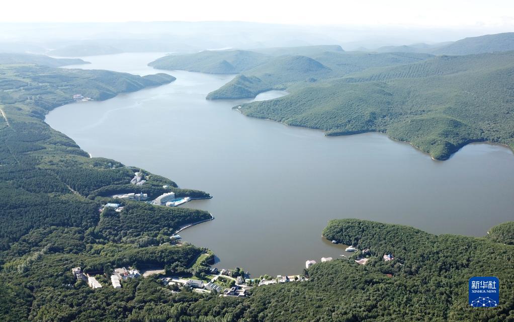 這是8月12日拍攝的鏡泊湖發電廠進水口附近的鏡泊湖湖區(無人機照片)。