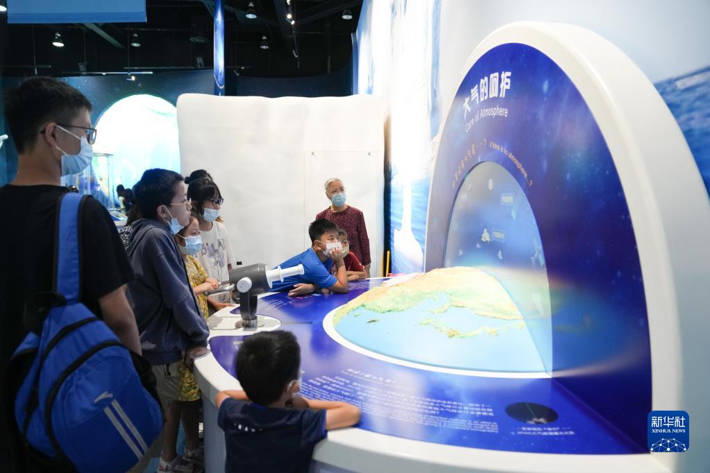 8月14日,在中國科學技術館,小朋友和家長在參觀名為“大氣的呵護”裝置。