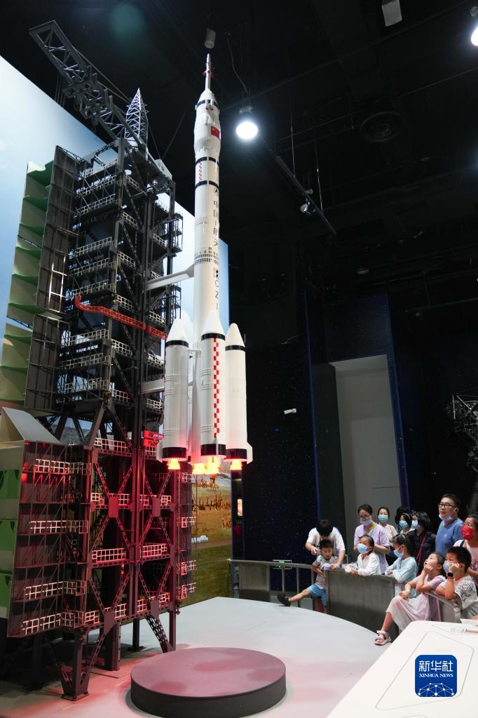 8月14日,在中國科學技術館,小朋友和家長參觀展示長征二號F型火箭的主要結構及發射過程裝置。