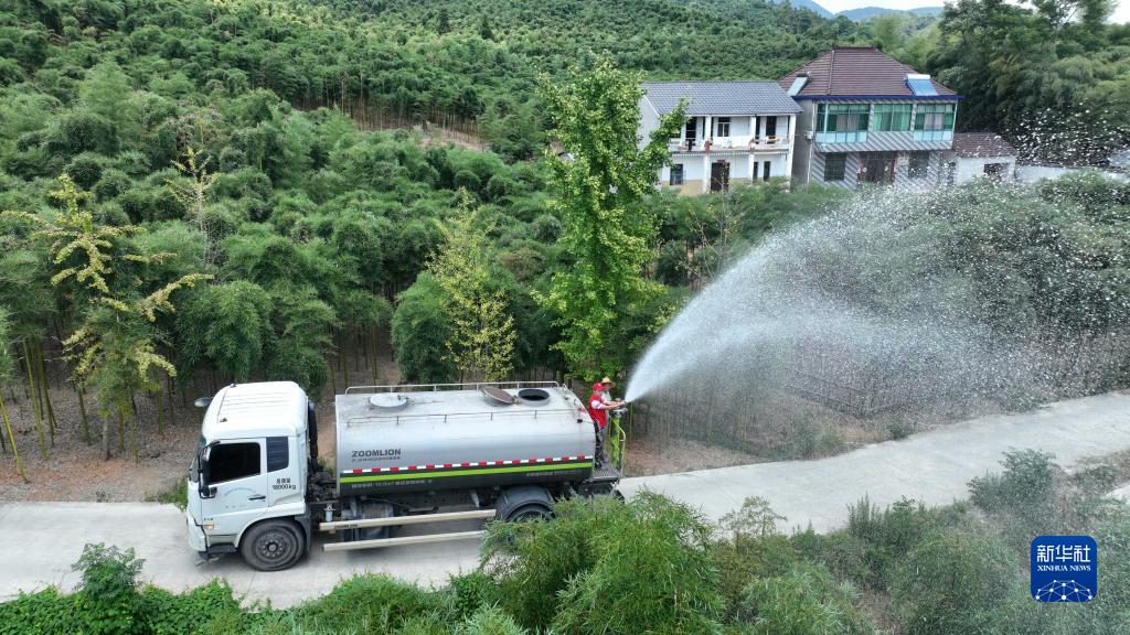 8月14日,在浙江省湖州市德清縣舞陽街道城山村早園筍種植基地,黨員志愿者幫助村民灌溉竹林(無人機照片)。
