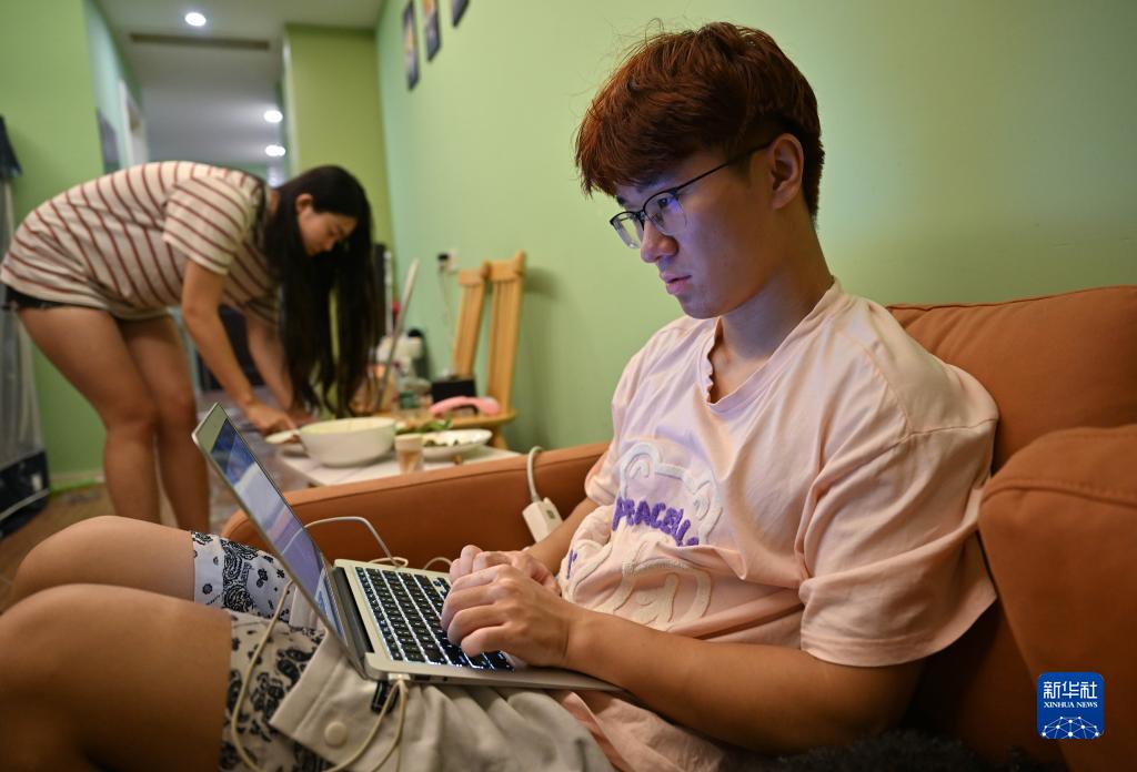 8月14日晚,張海洋(右)在家中上網課。他在俄羅斯阿列赫姆國立大學讀研二,受俄羅斯疫情影響,目前在國內通過網絡上課。