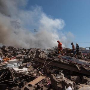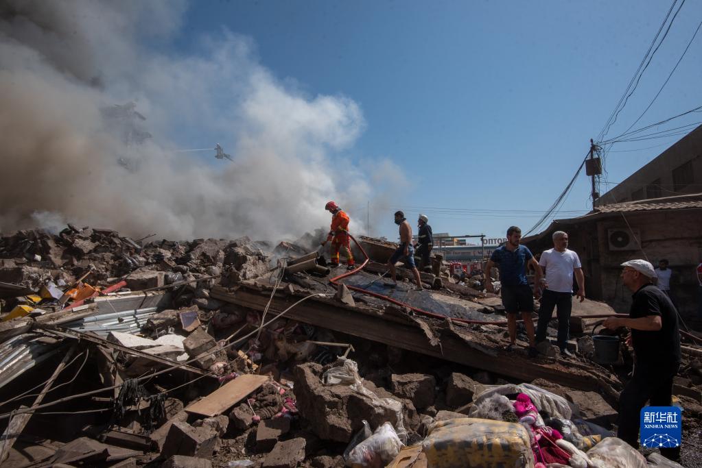 8月14日,救援人員在亞美尼亞首都埃里溫的購物中心爆炸現場工作。