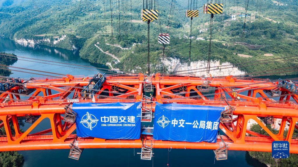 8月15日拍攝的德余高速烏江特大橋合龍現場(無人機照片)。