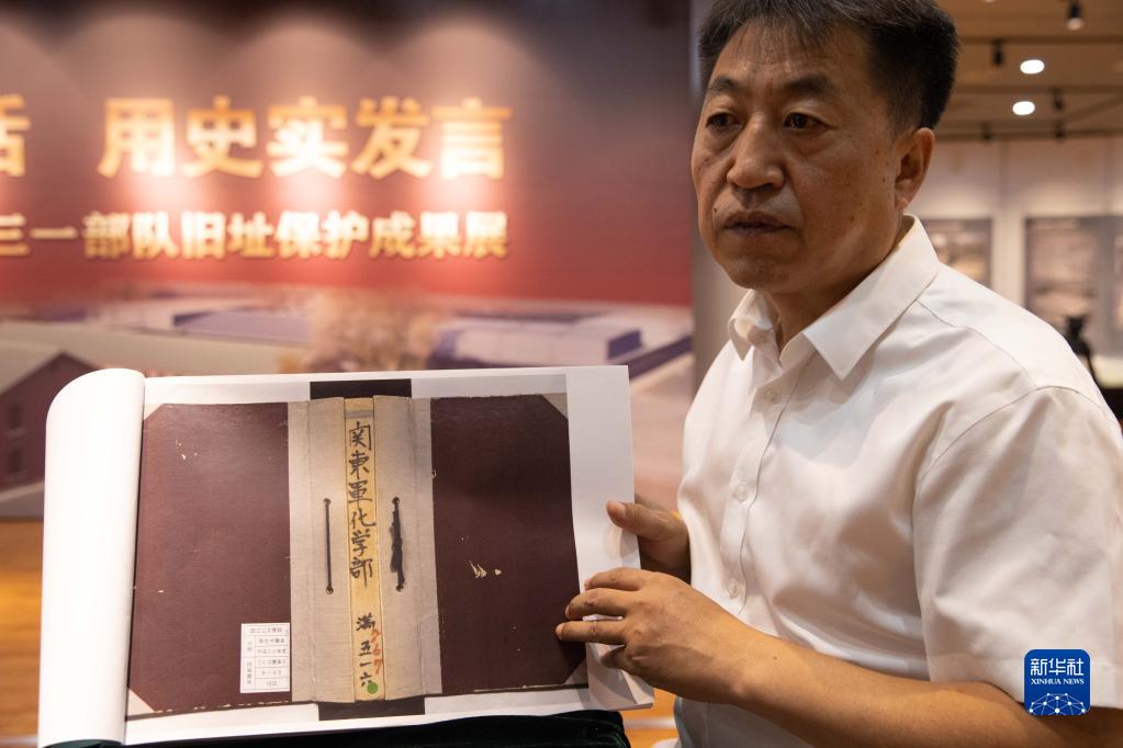 侵華日軍第七三一部隊罪證陳列館館長金成民向記者介紹《關東軍化學部留守名簿》(8月13日攝)。
