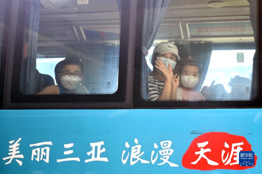 8月15日,游客在三亞一家酒店門前乘坐免費大巴前往機場。