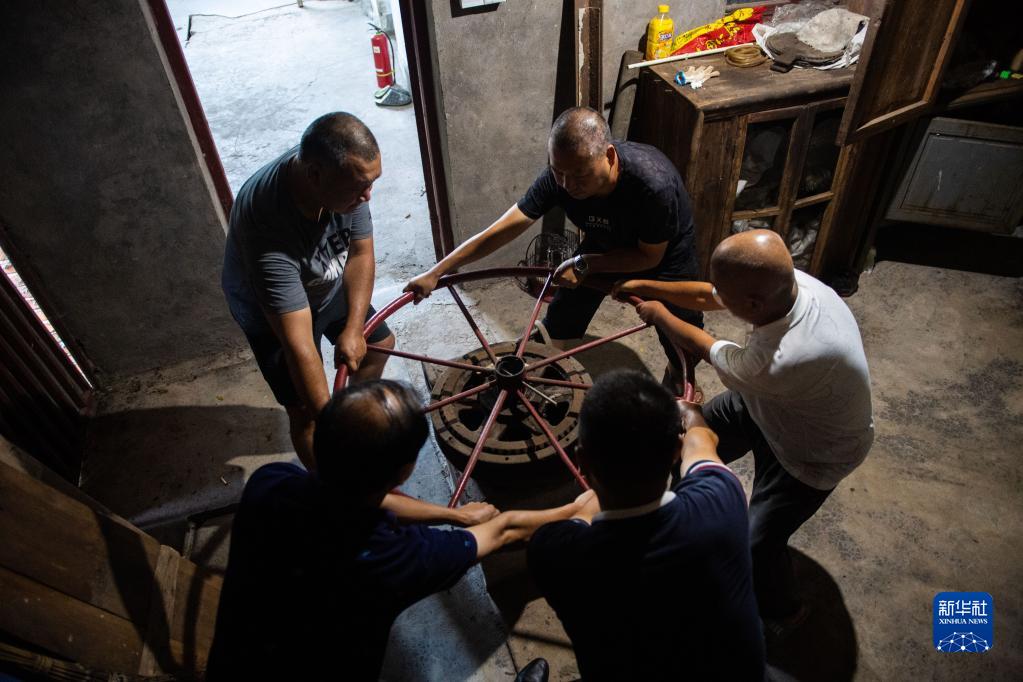 8月15日,在桃源縣三里溪水庫,水庫工作人員合力打開灌溉水源控制閘。