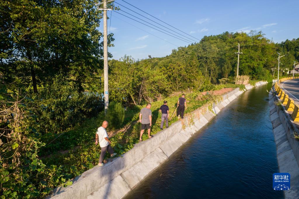 8月15日,在桃源縣三里溪水庫附近溝渠,水庫工作人員在巡堤(無人機照片)。