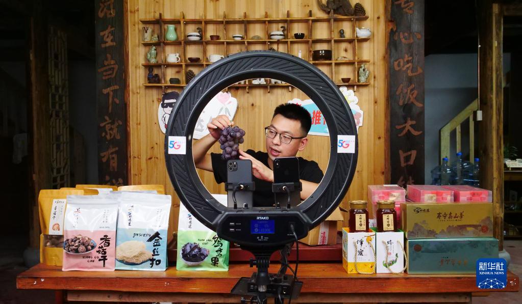 2021年8月17日,返鄉創業青年陳上友在下黨村78號直播間向粉絲介紹當地的農產品。