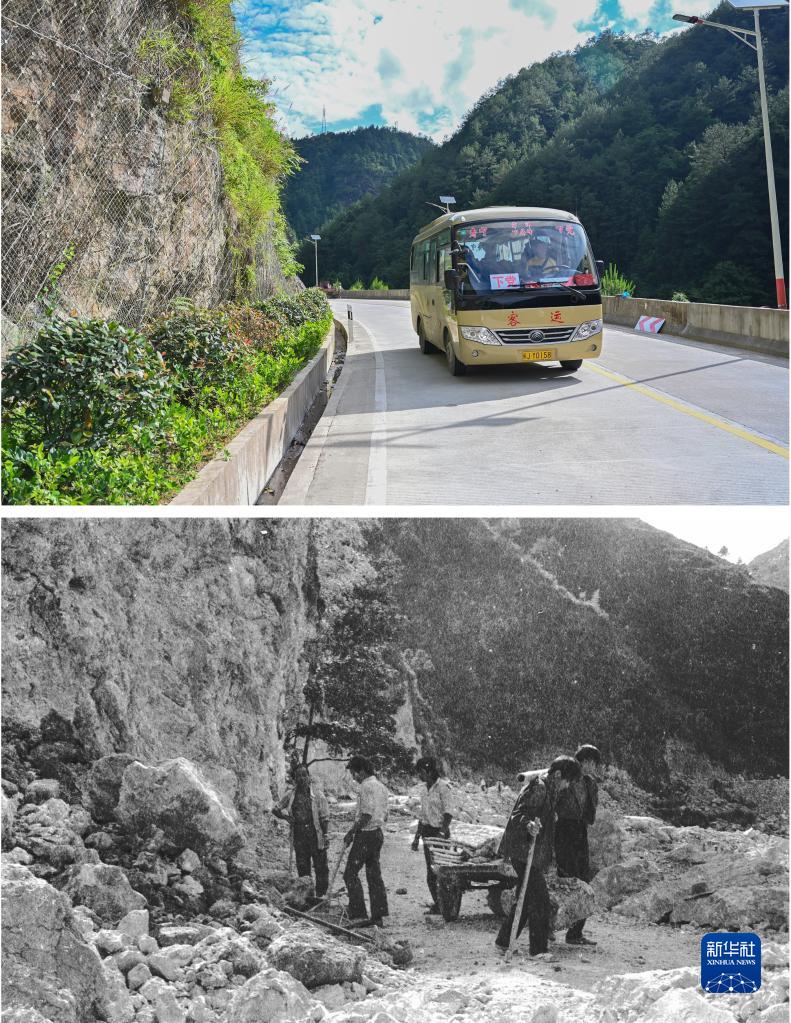 這是一張拼版照片。上圖為2022年6月23日拍攝的行駛在下黨村公路上的中巴客車(新華社記者周義攝);下圖為1990年7月下黨村村民修路的場景(資料照片)。