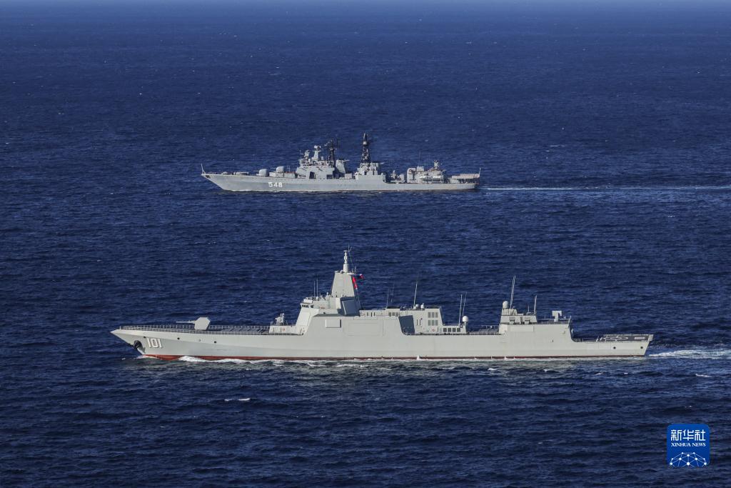 在中俄“海上聯合-2021”軍事演習中,南昌艦(下)與俄方艦艇聯合航渡(2021年10月15日攝)。