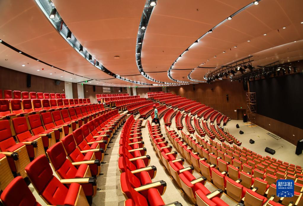 建設者在香港科技大學(廣州)報告廳內檢查設備(8月16日攝)。