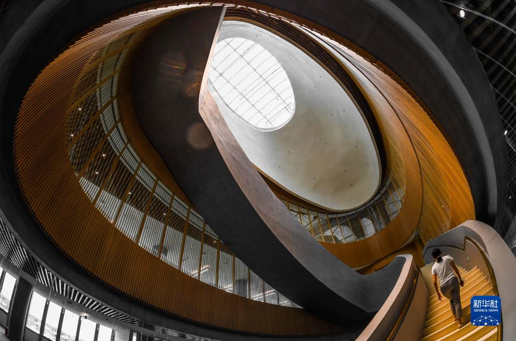 一名工作人員行走在香港科技大學(廣州)圖書館的樓梯上(8月16日攝)。