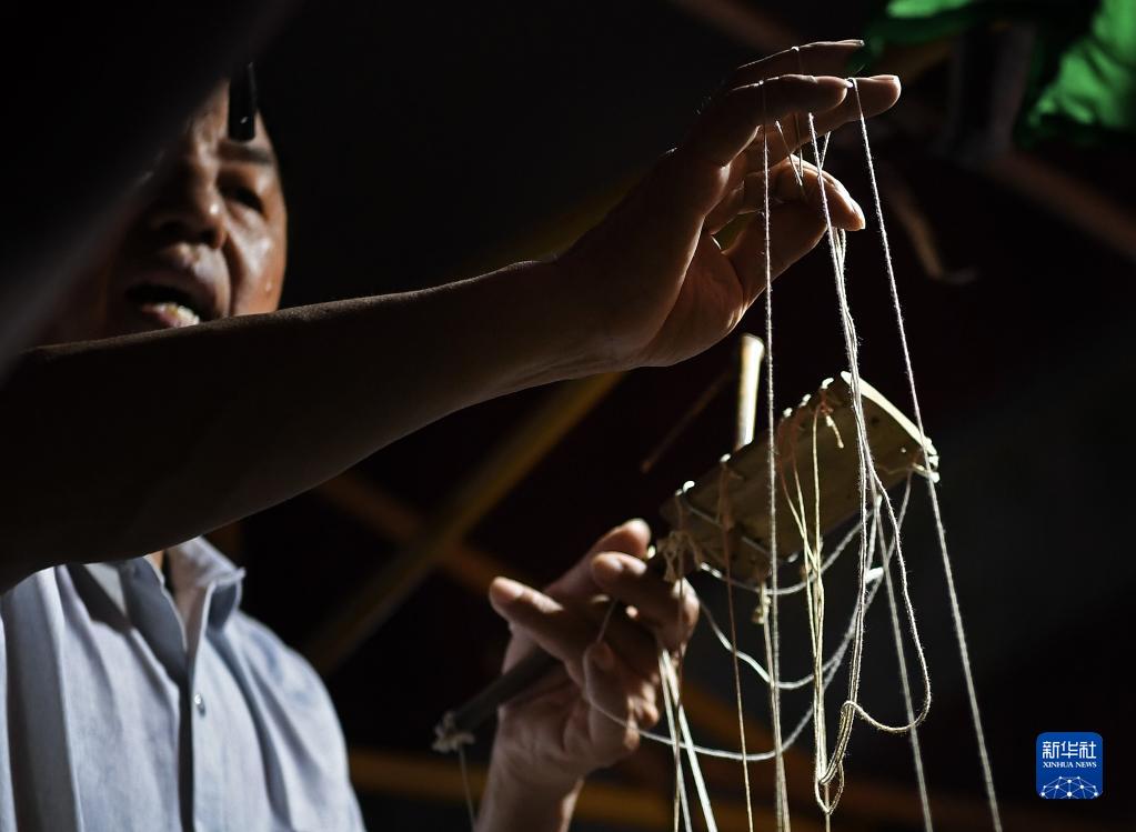 在江西省廣昌縣塘坊鎮大株村,木偶劇團團長謝幫銀在表演木偶戲(8月10日攝)。