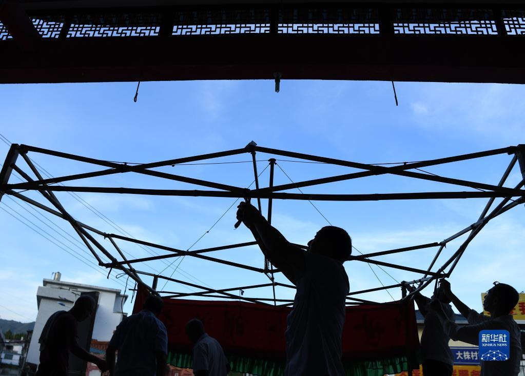 在江西省廣昌縣塘坊鎮大株村,木偶劇團成員在搭臺(8月10日攝)。