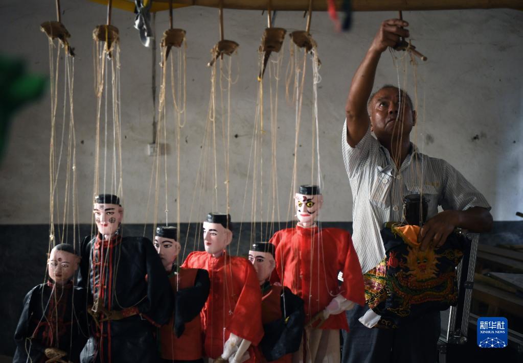 在江西省廣昌縣塘坊鎮淇田村,木偶劇團成員在收拾木偶,準備前往大株村演出(8月10日攝)。